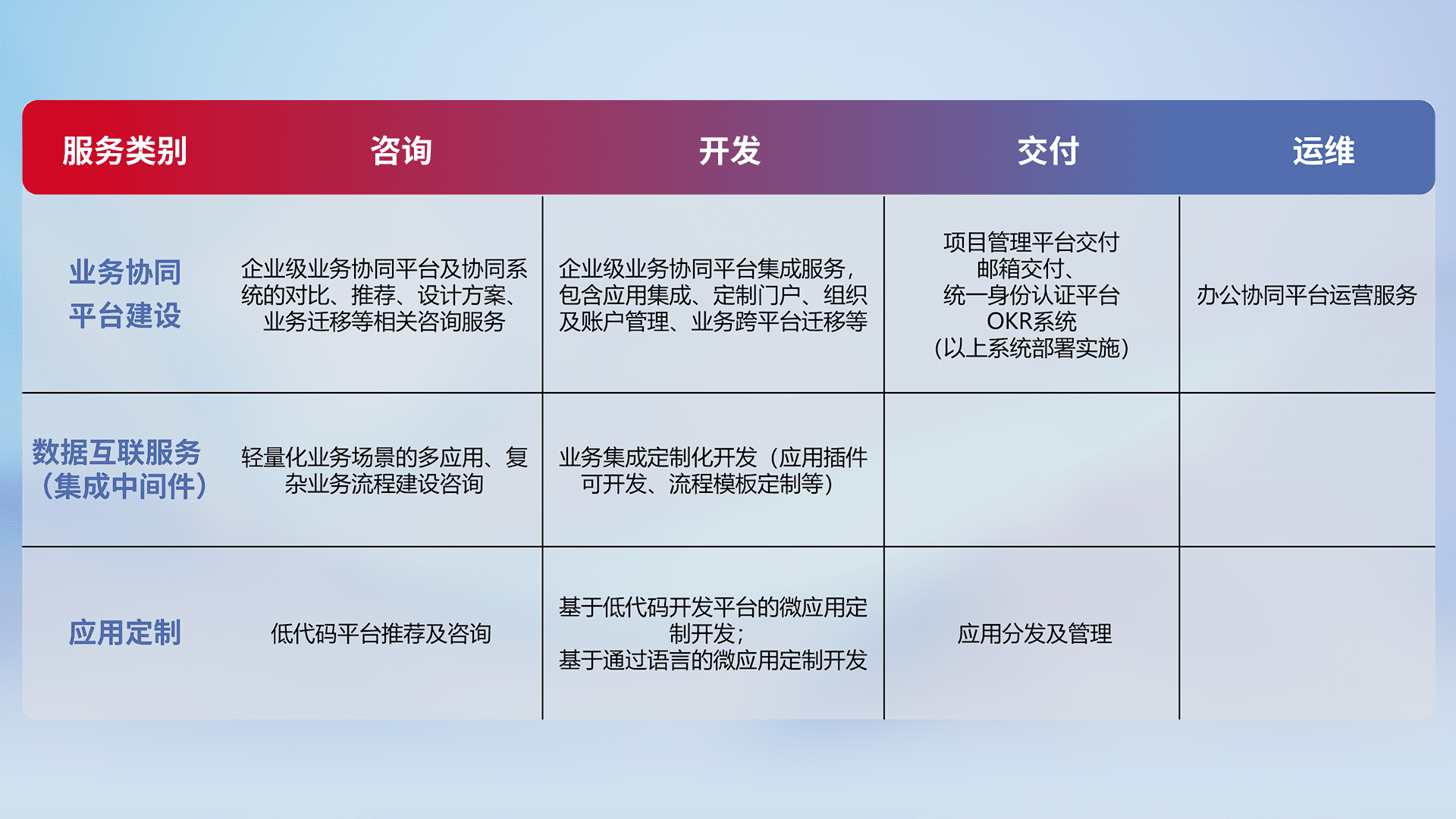 针对钉钉、、、、企微、、、IDaas等平台级产品提供产品的规划、、方案、、、、交付、、定制化开发等服务,,,,实现如统一协同办公、、、、智能客户服务、、、、混合会议管理、、智能数据查询、、等业务场景,,,,实现数字化转型。。。。